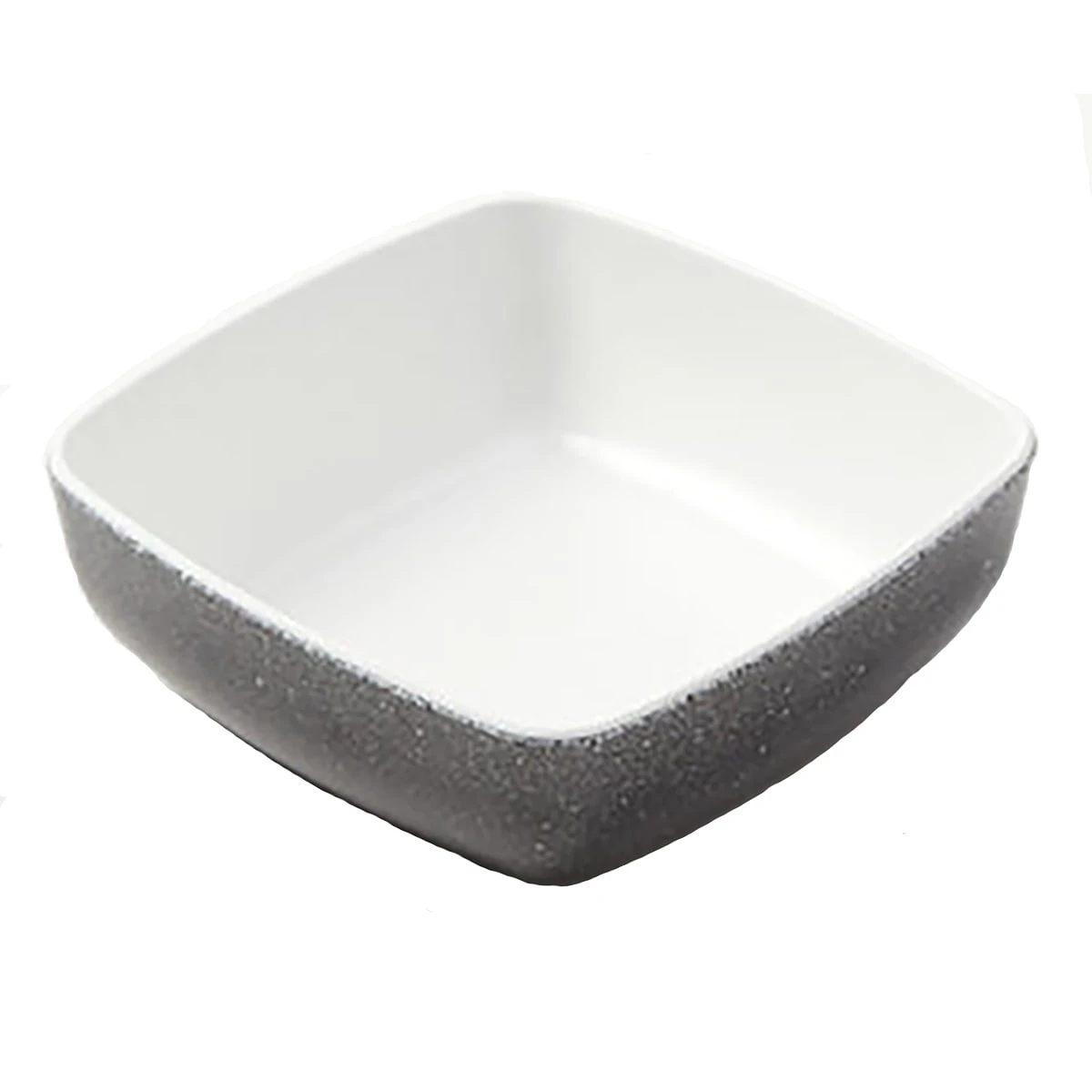 This reusable collection of bowls was curated with reinvention of buffet and group dining in mind. Made of dishwasher-safe melamine, this bowl is white on the inside with black speckles on the outside.