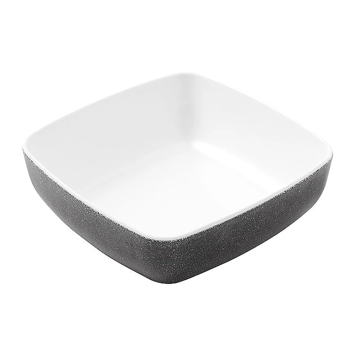 This reusable collection of bowls was curated with reinvention of buffet and group dining in mind. Made of dishwasher-safe melamine, this bowl is white on the inside with black speckles on the outside.