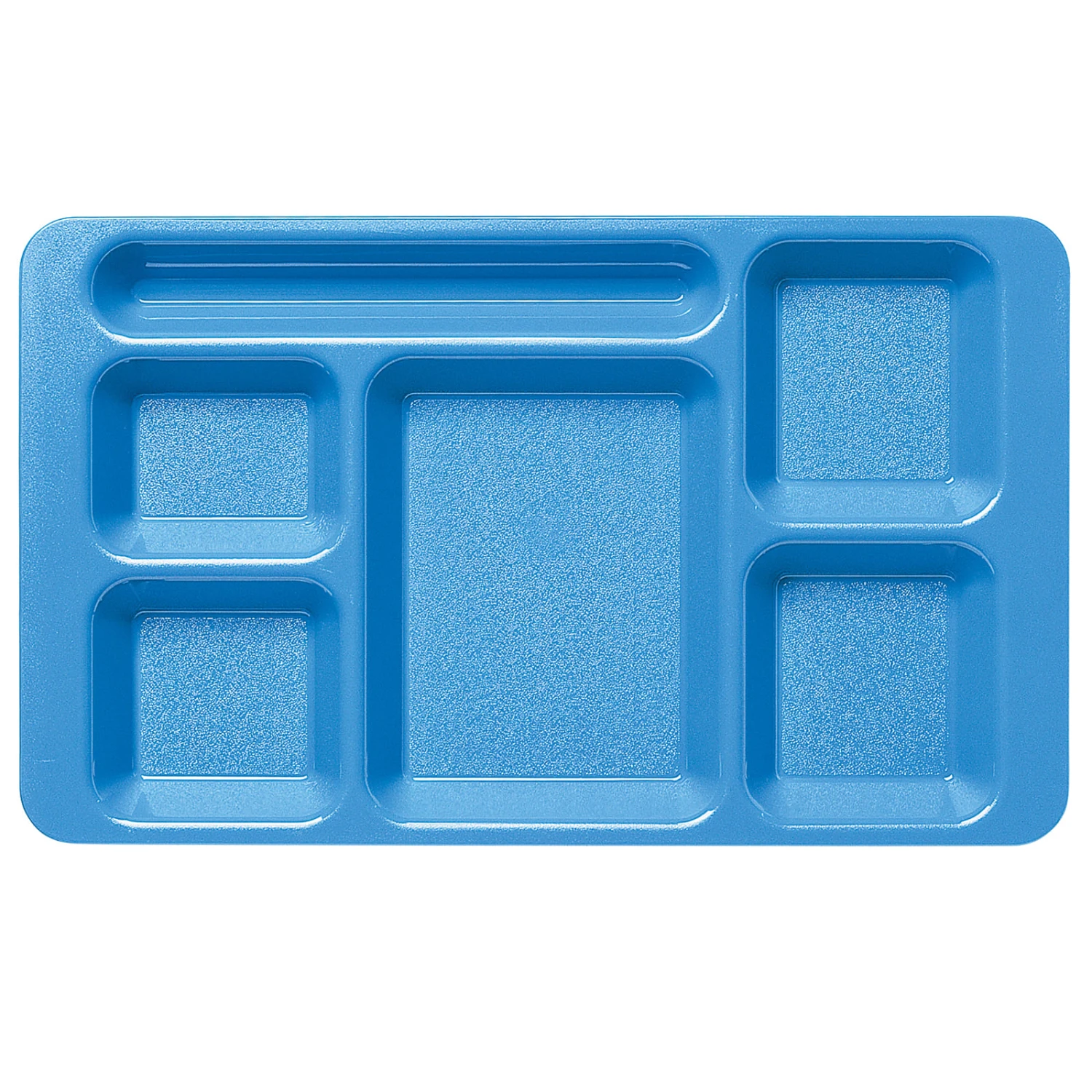 Brighten up your school, university, hospital, institution, or day care facility with this six compartment serving tray is made from economical, unbreakable polycarbonate material with five food compartments and one compartment for silverware. For added convenience, easy grip handles ensure that children with smaller hands will be able to firmly grip their tray. It’s space saver design allows you to fit two trays side‐by‐side in a standard dish rack. To promote quick draining and faster drying, each compartment features gradual sloping walls.