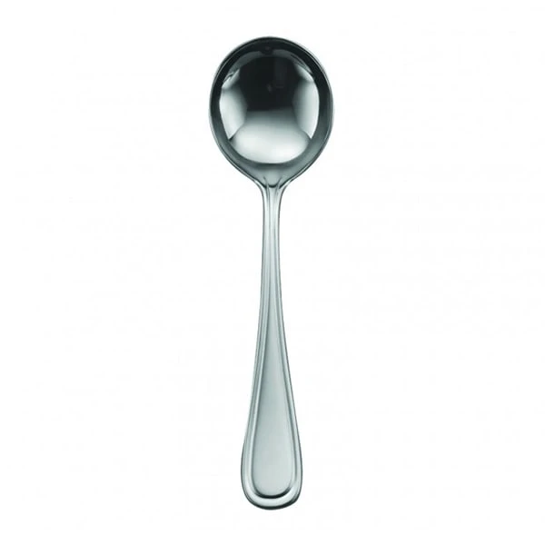 This graceful soup spoon from the Oneida New Rim II line has graceful lines that gives it a simple elegance. The durable 18/0 stainless steel craftsmanship will complement a variety of dining presentations.