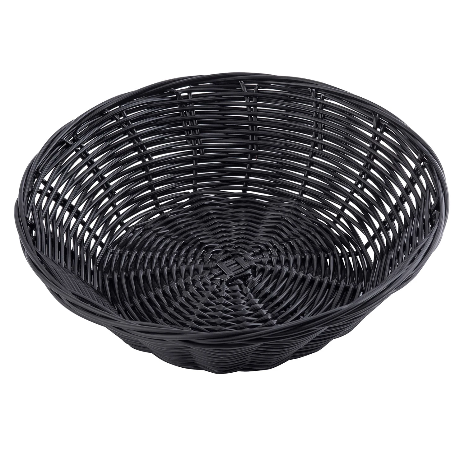 This black round rattan basket is a great solution for serving bagels, breads, pastries, and other food items. it’s woven polypropylene cord construction is easy to clean with a damp cloth.