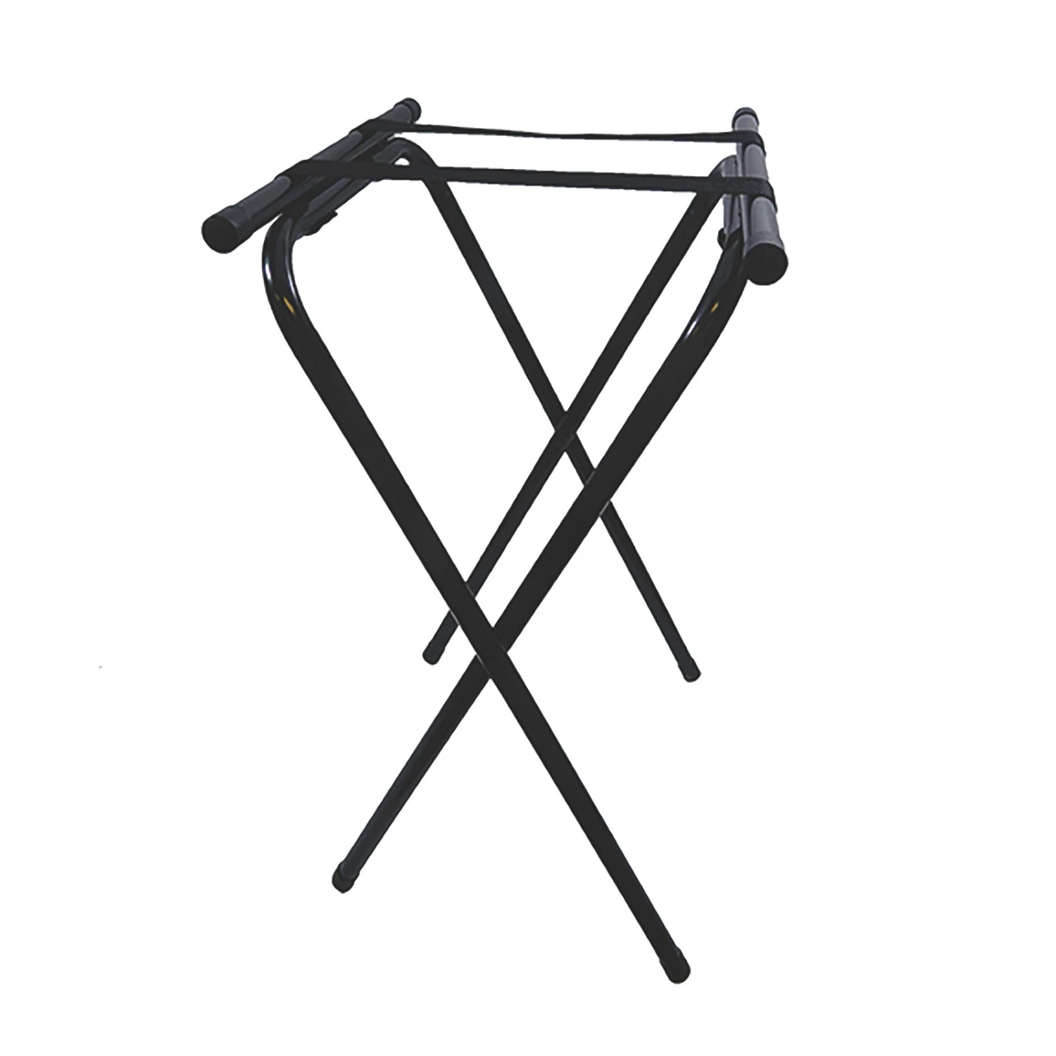 This durable black tray stand from TableCraft features heavy tubular construction with rubber slip‐proof top rings.