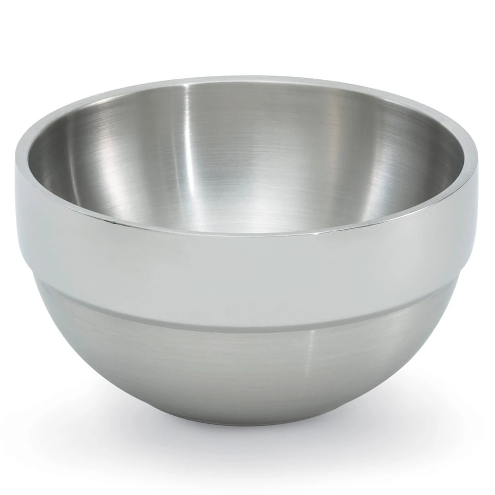 This 1.7 quart bowl from Vollrath® features double wall construction that provides insulation to maintain proper food temperature. This bowl is made of heavy gauge stainless steel with a beautiful satin finish and a contrasting mirror finish ring. It requires no preheating or chilling and will not sweat. This 7-1/4″ round bowl is dishwasher safe and NSF listed.