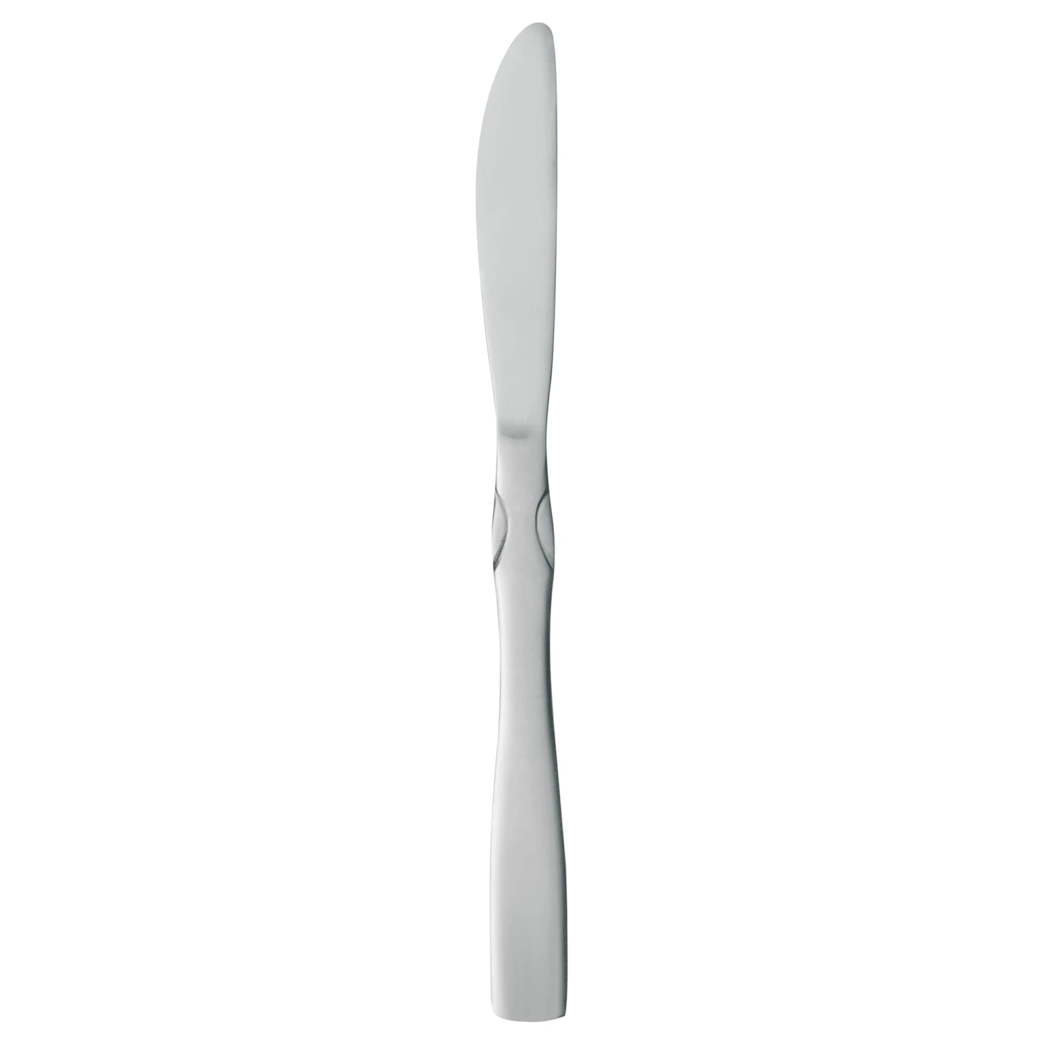 This 8‐3/8″ solid handle dinner knife features the gentle curves of the Salem pattern with brushed satin finish handles and mirror finish bowls and tines. The satin finish helps hide fingerprints.