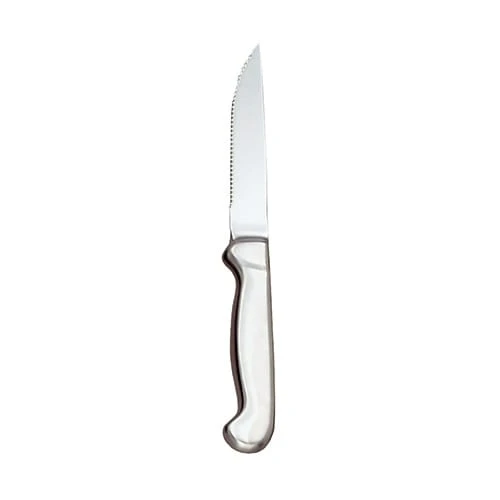 This hollow handle Slim Radiant steak knife features an all‐stainless steel construction with a pointed tip and a satin finish. These knives are commercial dishwasher safe. It is recommended that they are washed standing up in a flatware rack and not laying flat in a open rack.