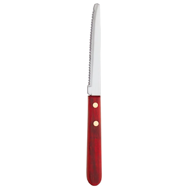 This 8‐1/4″ round tip steak knife features a stainless steel blade and a red Pakka wood handle. These knives are commercial dishwasher safe. It is recommended that they are washed standing up in a flatware rack and not laying flat in a open rack.