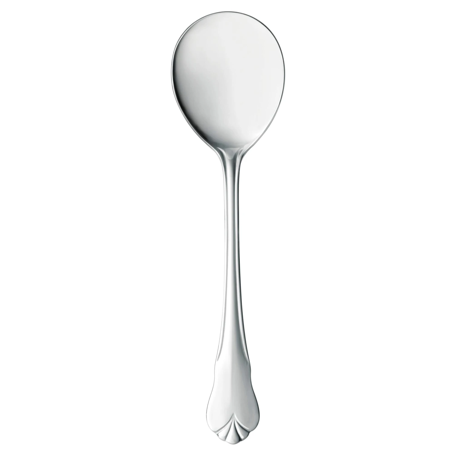 This 6‐1/8″ bouillon spoon features the scalloped, fan‐styled handle of the Diana pattern in durable stainless steel.